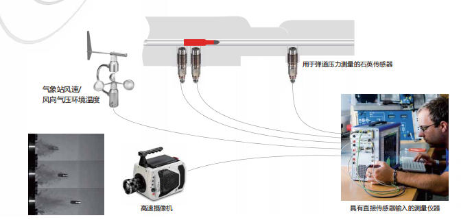 对于枪管或炮管中的压力测量,最少使用一个或最多三个用于弹道压力的石英传感器。 我们的产品支持各种不同的传感器 和其他信号输入,例如点火针加速度、目标控制系统(光幕)、用于火速测量的麦 克风或高速摄像机,可以轻松集成到系统中。该配置可以满足当前的需求,最重要的是可以轻松配置用于现场或实验室的其他测量。
