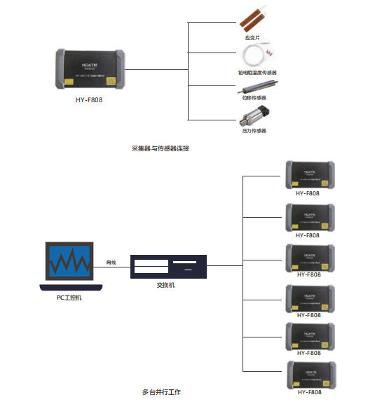 HY-F808分布式数据采集和分析系统,专为满足现场测点零散的场合而设计,最高采样频率8kHz,广泛应用于疲劳试 验、结构强度应力应变试验,分散型传感器的数据采集,分布式温度采集。支持单台独立使用,也支持多台联网同步使 用。设备支持应力应变信号、电压信号、位移信号、温度信号等物理量同步采集、存储和分析。 该产品广泛应用于各种现场信号采集和测试测量,在工业现场,高校实验室,科研院所台架试验,各种结构强度测量场景 大量应用,并获得客户一致好评。