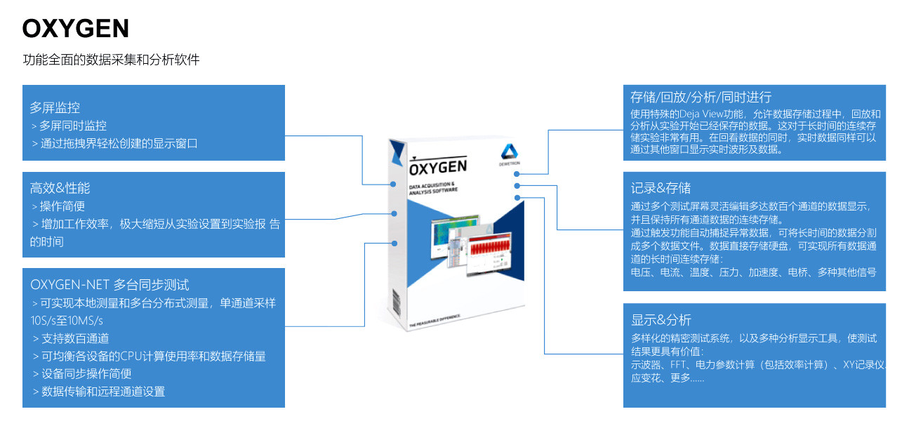 数据采集是OXYGEN软件强大的基础功能,可以连续的同步采集不同种类的信号:模拟,数字,编码器,CAN,网络,视频,GPS等等